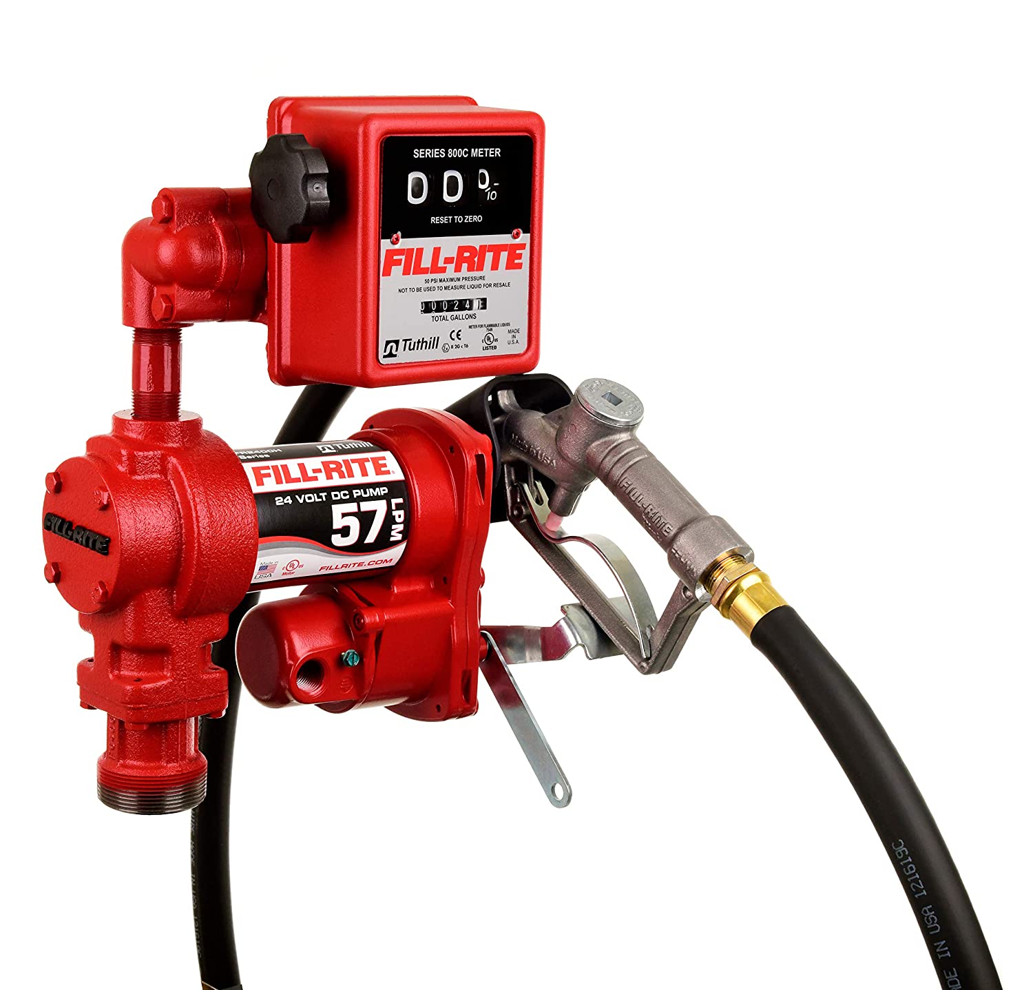 Kit que incluye bomba, medidor, manguera y pico para despacho de combustible hasta 50 litros por minuto. Fuente de 12V. Marca Fill Rite.