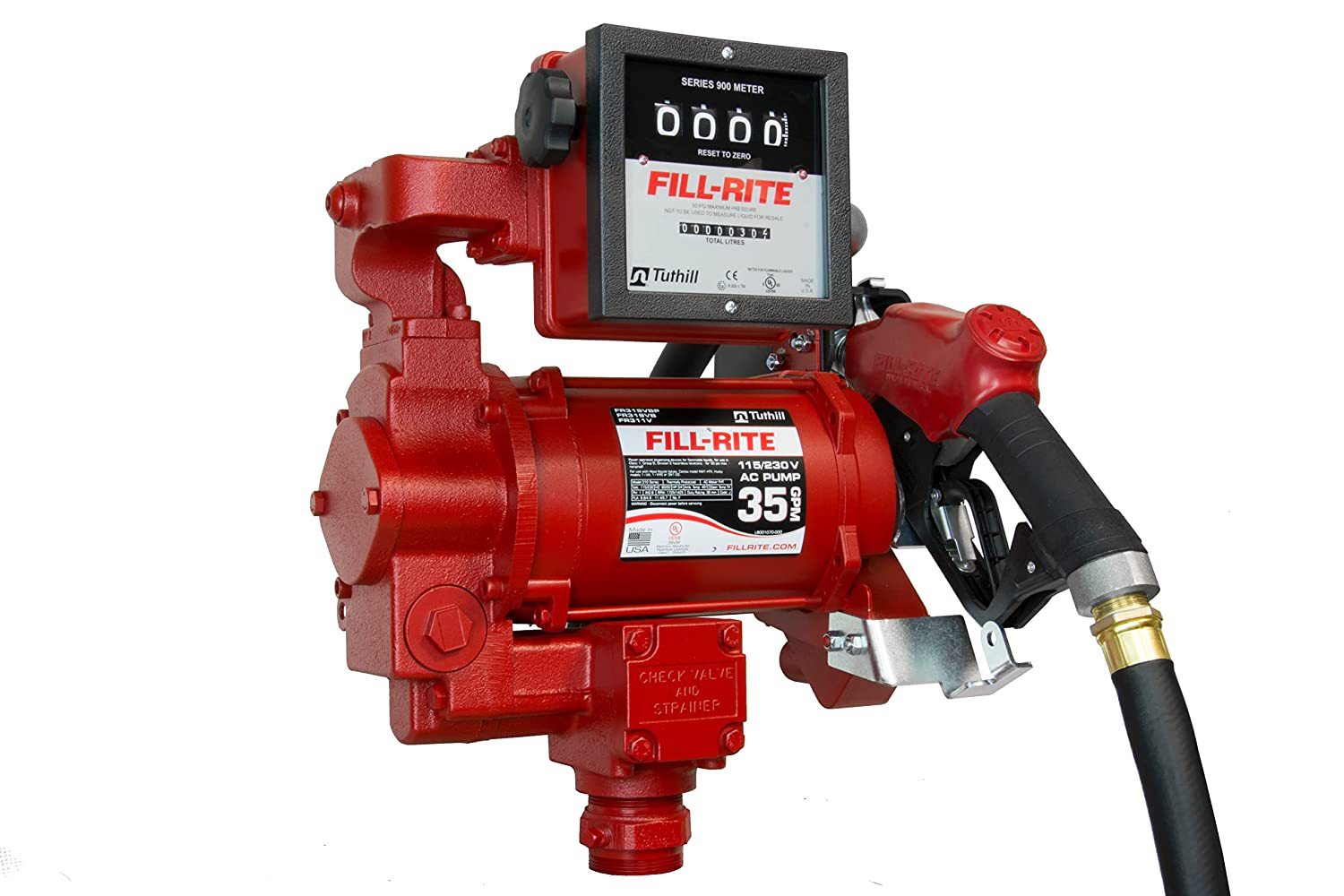Kit que incluye bomba, medidor, manguera y pico para despacho de combustible hasta 70 litros por minuto. Fuente de 220V. Marca Fill Rite.
